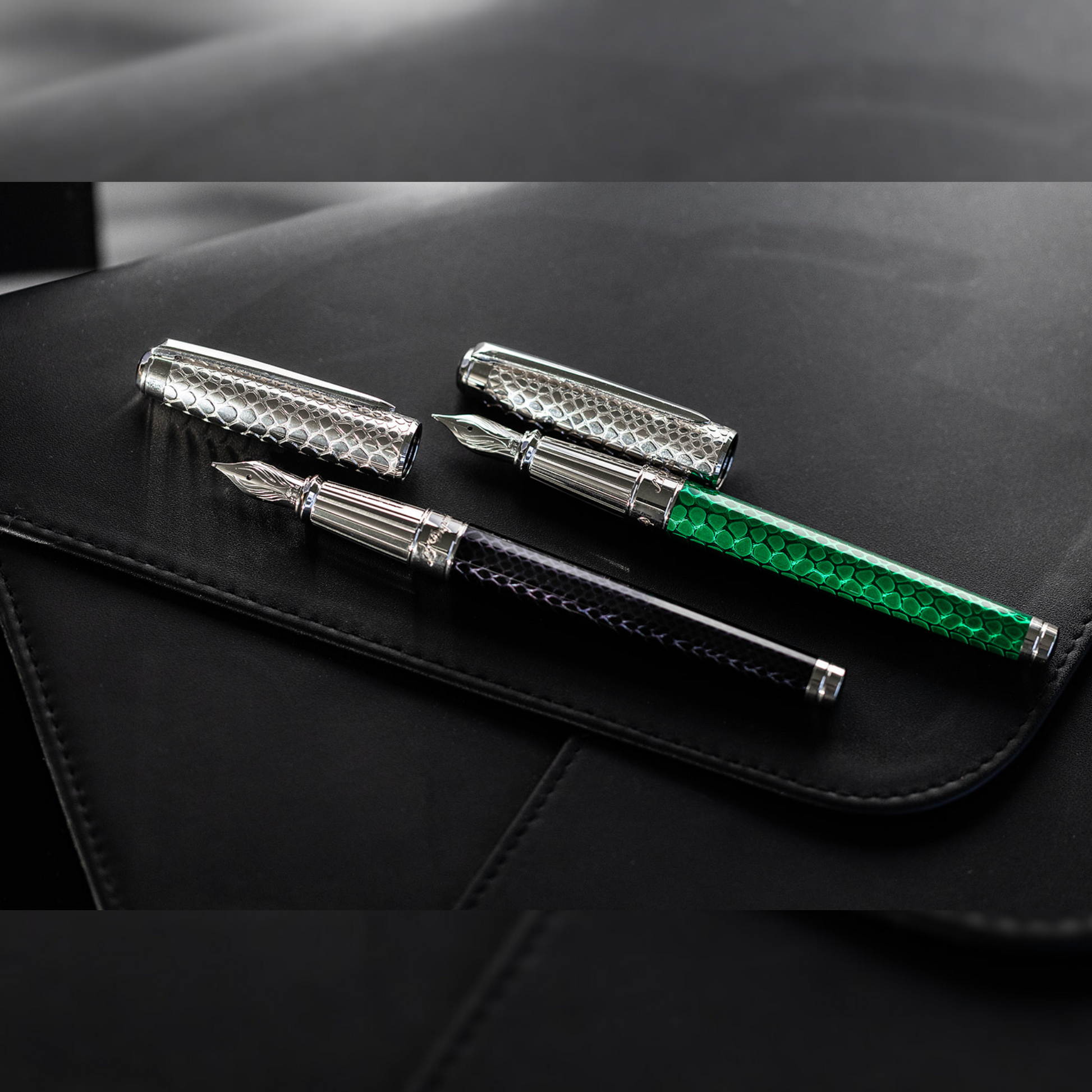 Guilloche, a specialty of the Maison, takes center stage in this collection. The captivating elegance of the Snake Skin collection features a stunning snake-skin pattern engraved on both the cap and body, and is finished with S.T. Dupont's signature vibrant green and classic black lacquer.